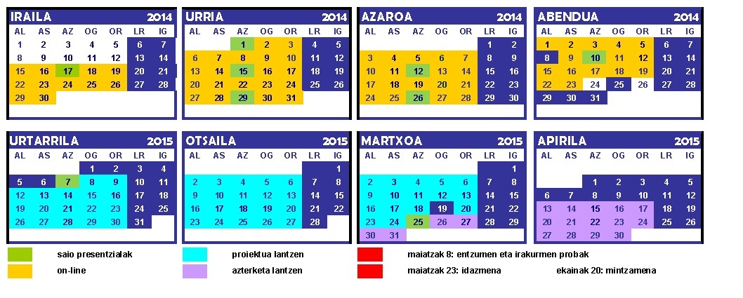 - Edukiak lantzeko, 15 egunik behin, 3 orduko saio presentzial bat, irailetik abendura bitartean; guztira, 7-8 saio.